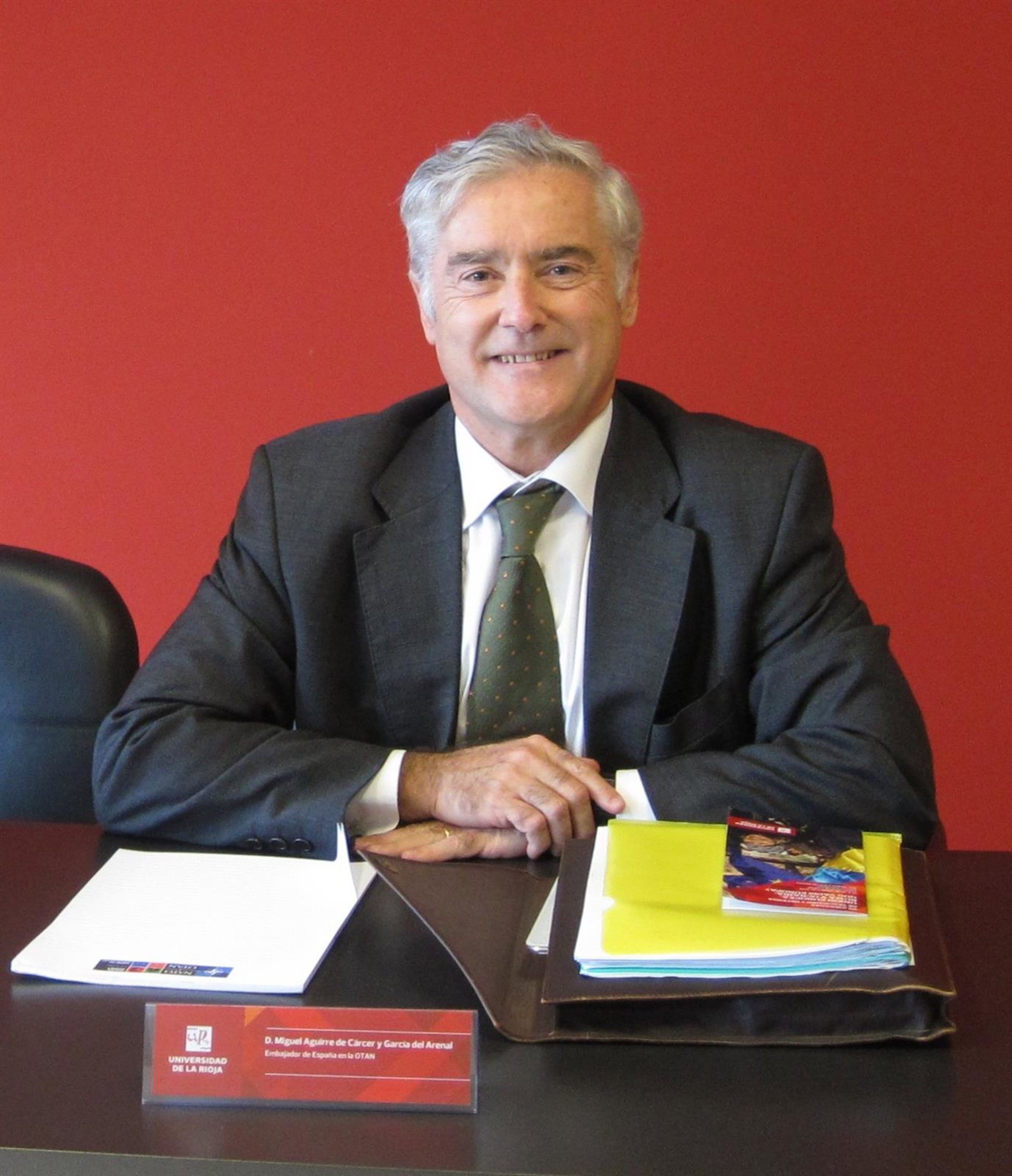 Aguirre de Cárcer participa esta tarde en la apertura de las VII Jornadas de Seguridad y Defensa de la Universidad de La Rioja, que este año se celebran bajo el título 'Unión Europea, Rusia y Ucrania: Quo Vadis Europa?'.