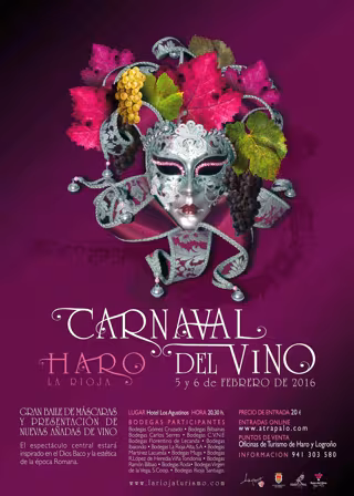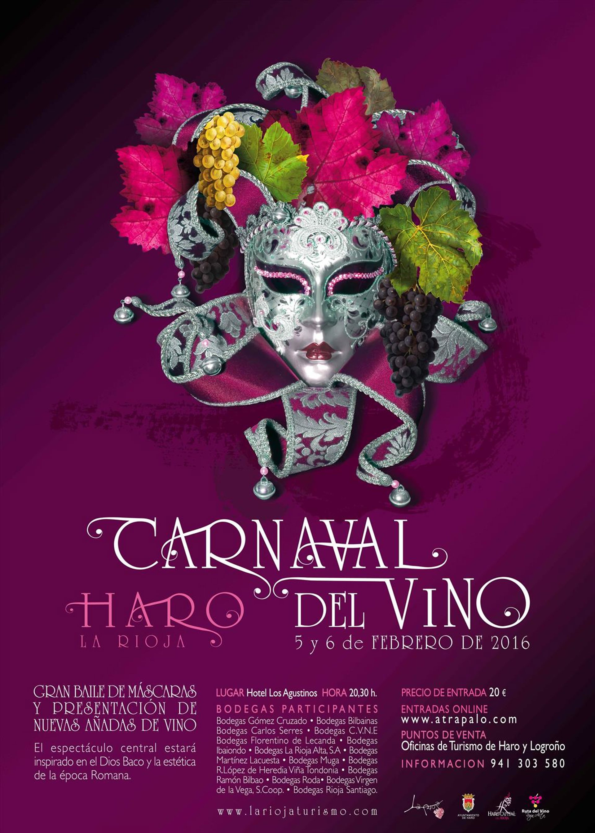 Cabe recordar que el Carnaval del Vino de Haro tendrá lugar en el hotel Los Agustinos, a partir de las 20,30 horas. Habrá una gran baile de máscaras y presentación de nuevas añadas de vino. El espectáculo central estará inspirado en el Dios Baco y la estética de la época Romana. El precio de las entradas es de 20 euros.