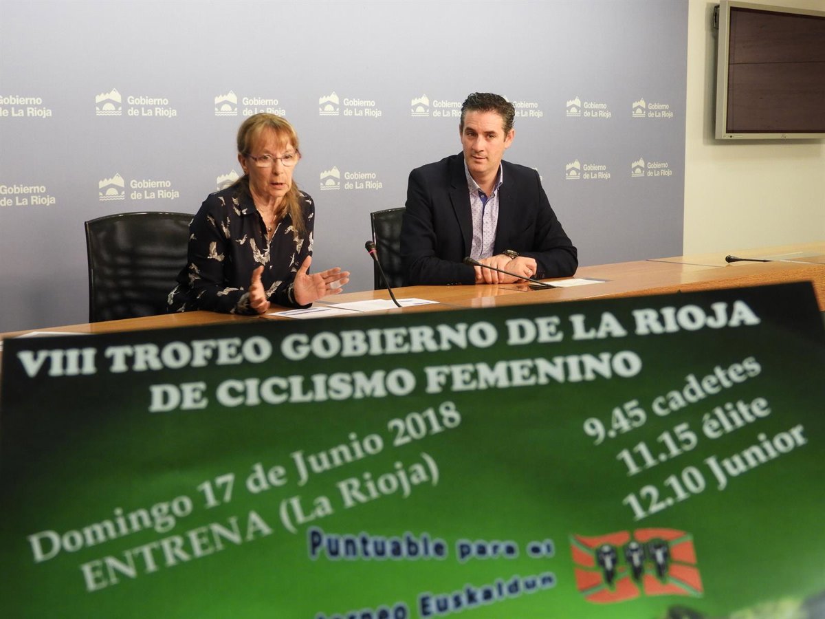 El director general del Deporte y del IRJ, Diego Azcona, junto con la presidenta de la Federación Riojana de Ciclismo, Begoña Ruiz, ha presentado esta mañana el VIII Trofeo Gobierno de La Rioja de Ciclismo Femenino, que se el próximo domingo, 17 de junio, en la localidad de Entrena.
