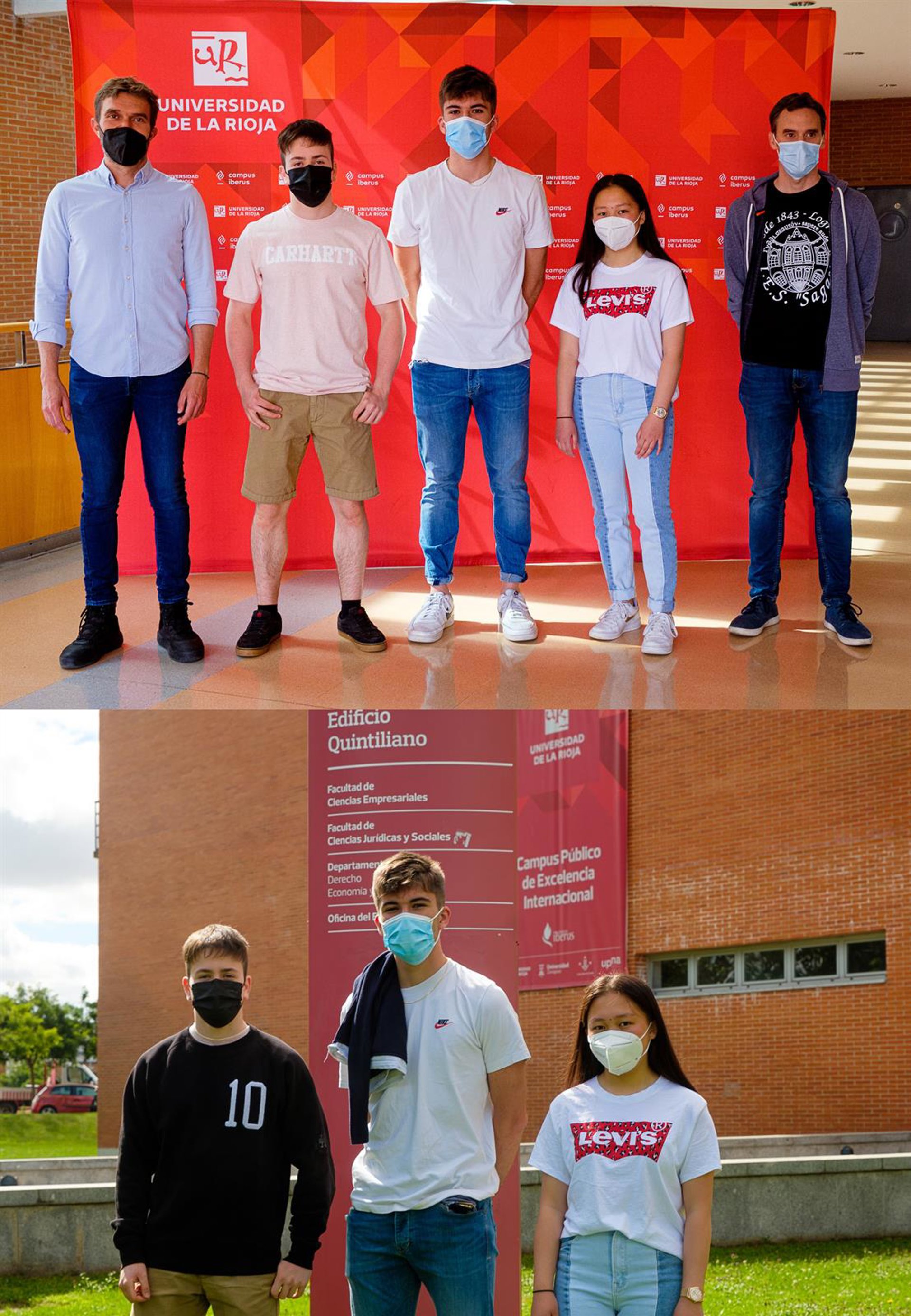 Abajo, Ánder Bastián, del IES Cosme García; Pedro Iriarte, del IES Sagasta; y Shuqi Zheng, del IES DElhúyar. Arriba, estos entre Luis Blanco decano de la Faculta de Economía y Empresa, y Raúl Viñarás, profesor de Economía de IES Sagasta - UNIVERSIDAD DE LA RIOJA