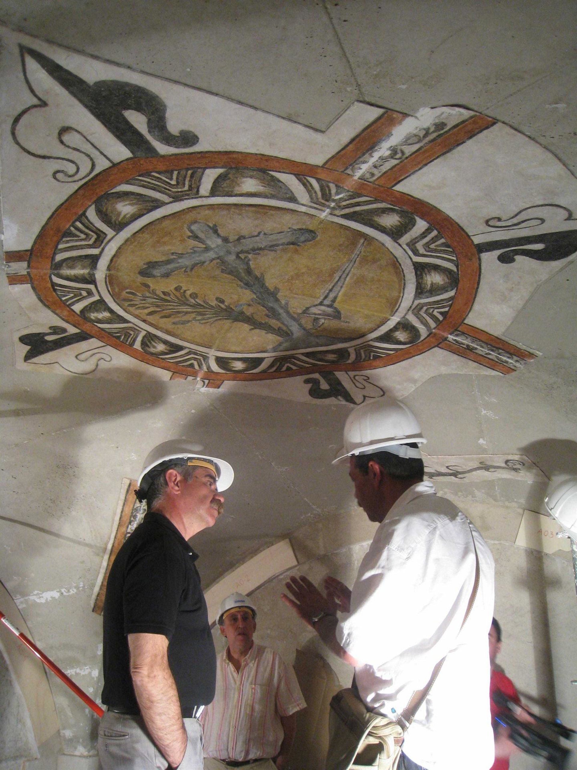 A lo largo de siete meses, los especialistas del Taller Diocesano de Restauración de Santo Domingo han trabajado en la recuperación de las pinturas. En primer lugar, en la extracción de las mismas de las paredes y bóvedas del edificio con el fin de trasladarlas al taller de restauración. Una labor que, por ejemplo en el caso del escudo, se realizó con ayuda de una grúa y a través de la bóveda de la escalera.