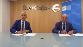 El presidente de la FER, Jaime García-Calzada, y el director territorial de Ibercaja en La Rioja, Burgos y Guadalajara, Jesús Les Mancho, han firmado esta mañana este acuerdo en la sede de Ibercaja, con la confianza de que este acuerdo contribuirá a la recuperación de las actividades y la mejora de las condiciones financieras de las empresas y de los autónomos riojanos.