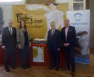 El director general de Cultura y Turismo, Eduardo Rodríguez Osés y el alcalde de Pradejón, Óscar León, han presentado este martes en el Centro Riojano de Madrid 'Fungitur 2018', la muestra anual con la que Pradejón rinde un pequeño homenaje al liderazgo nacional en la producción de champiñón y setas, y a la interculturalidad que recorre las calles de la localidad.