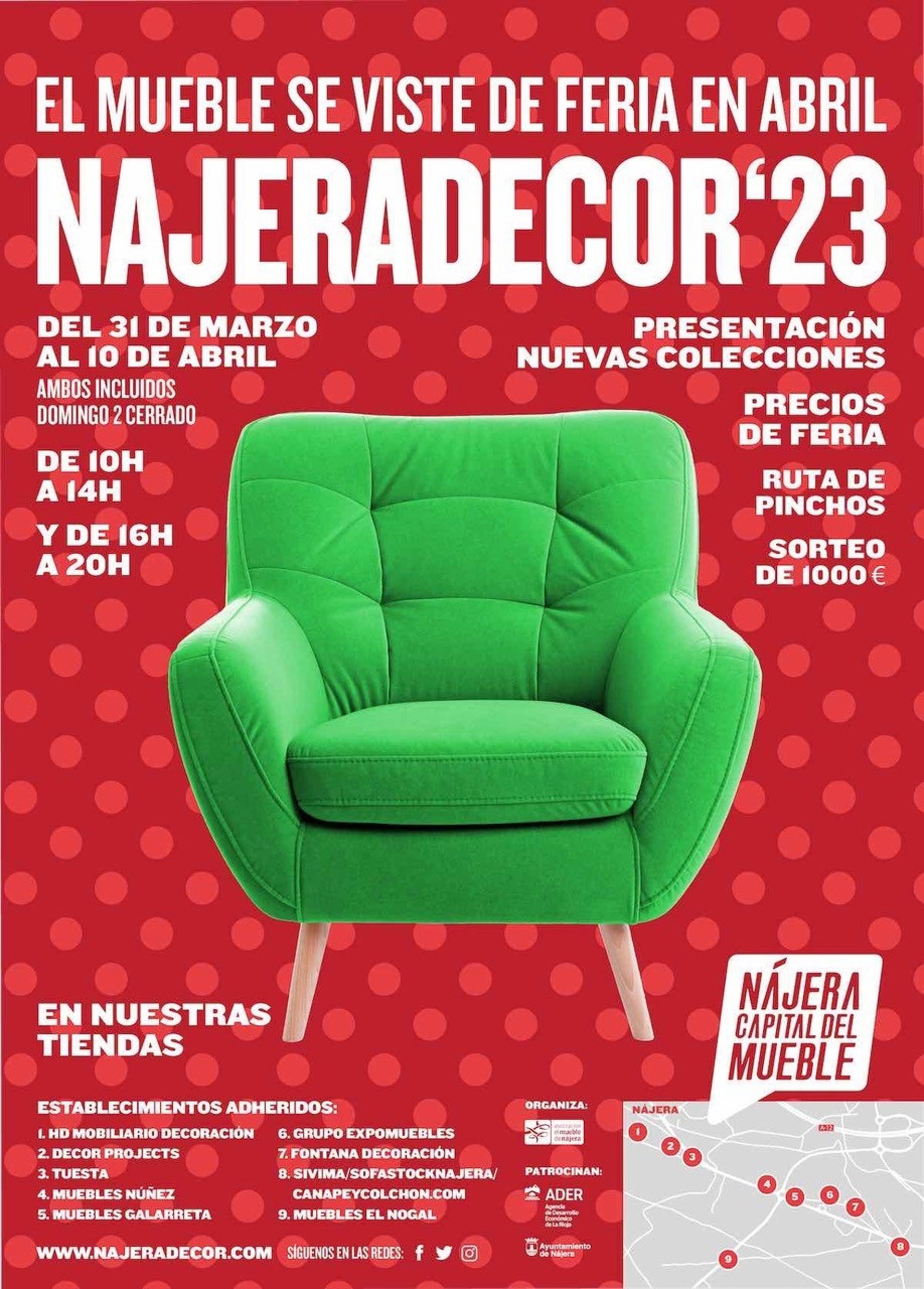 La muestra NájeraDecor, organizada por el Ayuntamiento de Nájera y la Asociación El Mueble de Nájera y en la que el Gobierno de La Rioja colabora a través de la ADER, alcanza en este año 2023 su edición número 29, que se desarrollará entre el 31 de marzo y el 10 de abril contando con la participación de un total de nueve empresas.