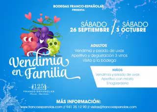 'Vendimia en familia' tiene un precio por persona de 25 euros para los adultos y 15 euros para los niños (4-18 años) e incluye material de trabajo, visita a la bodega, vino y aperitivo. Tiene una duración aproximada de 3 horas. La bodega está sita en Cabo Noval, 2 - Logroño (La Rioja). Para reservas e información: Enoturismo Tel.- 941 25 12 90 o email: visitas@francoespanolas.com