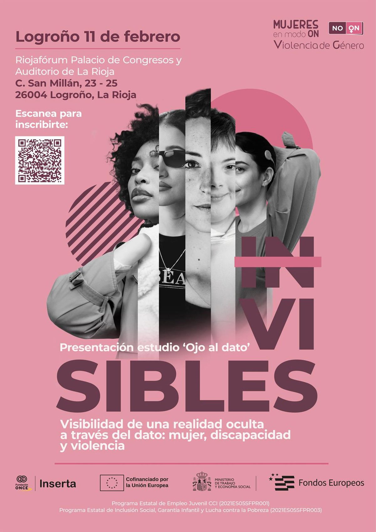 Fundación ONCE presenta este próximo miércoles 11 de febrero, a las 9,30 horas en Riojafórum, 'Ojo al dato. Visibilidad de una realidad oculta a través del dato: mujer, discapacidad y violencia', el primer estudio que Inserta Empleo, su entidad para la formación y el empleo ha realizado para visibilizar una realidad todavía desconocida.