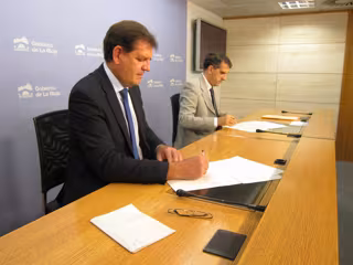 El consejero de Agricultura, Ganadería y Medio Ambiente, Iñigo Nagore, y el delegado de Iberdrola en La Rioja, Carlos Sobrino, han firmado esta mañana un nuevo convenio de colaboración para la adecuación de apoyos eléctricos con el objetivo de mejorar la protección de la avifauna.