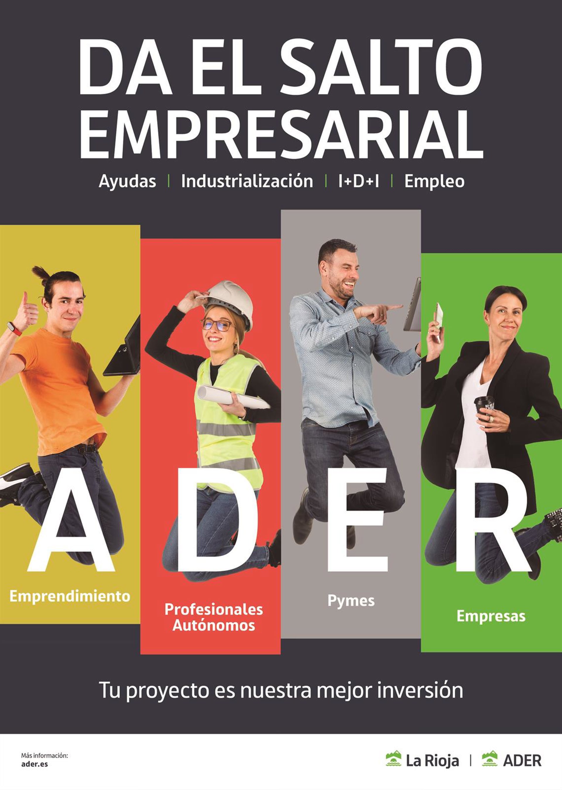 Bajo el lema 'Da el salto empresarial' y el mensaje 'Tu proyecto es nuestra mejor inversión', el objetivo del Gobierno de La Rioja es difundir el papel esencial de la ADER como una entidad abierta y a disposición de todas las empresas, pymes y autónomos de La Rioja para acompañarles y asesorarles en cada una de las etapas de su desarrollo