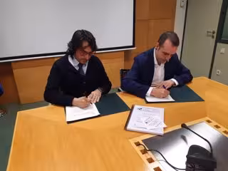 El consejero de Sostenibilidad y Transición Ecológica, José Luis Rubio, y el alcalde de Nájera, Jonás Olarte, han firmado hoy el convenio de colaboración para dirigir las obras de estabilización del talud de Peñaescalera.