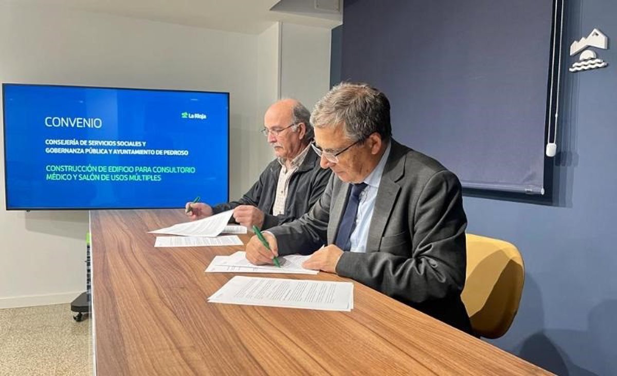 El consejero de Servicios Sociales y Gobernanza Pública, Pablo Rubio, y el alcalde del Ayuntamiento de Pedroso, Eduardo Alonso, han firmado este lunes un convenio de colaboración para financiar la construcción de un edificio que albergará un consultorio médico y un salón de usos múltiples. Esta infraestructura requiere una inversión de 400.000 euros de los que más de 360.000 euros proceden del Gobierno regional; unos 260.000 de la Consejería de Servicios Sociales y Gobernanza Pública y algo más de 103.000 euros de la Consejería de Salud.