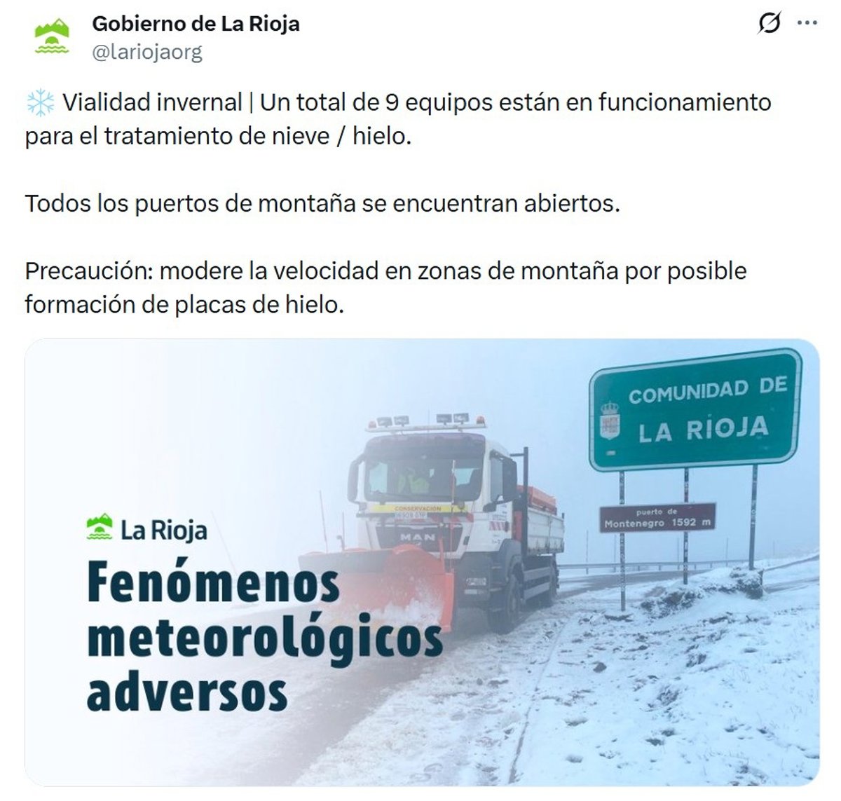 Un total de 9 equipos están en funcionamiento para el tratamiento de nieve o hielo en las carreteras de la región, según ha informado el Gobierno de La Rioja a través de un mensaje difundido en la red X.