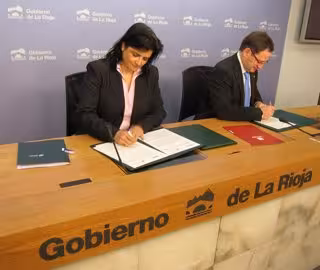 La consejera de Administración Pública, Concepción Arruga, y el rector de la Universidad de La Rioja, José María Martínez de Pisón, han firmado esta mañana un convenio de colaboración para la realización de prácticas por parte de los estudiantes del Grado de Trabajo Social de la UR en las diferentes unidades, organismos e instituciones del Gobierno de La Rioja.