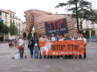Un gran 'Caballo de Troya', de 8 metros de altura, ha informado y "concienciado" este lunes en la Plaza del Mercado contra el "ocultismo" que supone la tramitación del Tratado Transatlántico de Libre Comercio e Inversiones (TTIP). Una campaña nacional, que ha llegado a Logroño de la mano de la Coordinadora No al TTIP, que forman en La Rioja un total de 23 colectivos.