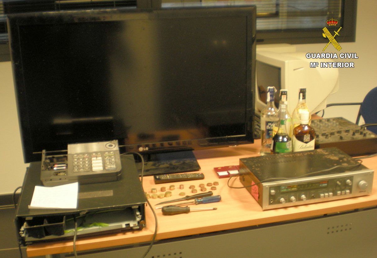 El registro llevado a cabo en la furgoneta y en la zona del robo, han servido para recuperar los siguientes efectos sustraídos del interior del bar: una televisión, un amplificador de música, un equipo de mezclas, tabaco, cinco botellas de bebidas alcohólicas y diversa herramienta.