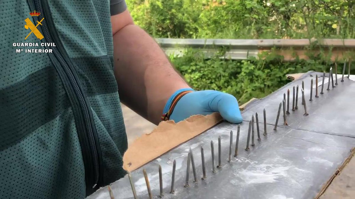 La Guardia Civil ha detenido a dos personas en Alesón por colocar clavos en la carretera con la intención de provocar accidentes, o causar daños a los vehículos, además de llevar droga y saltarse el confinamiento.