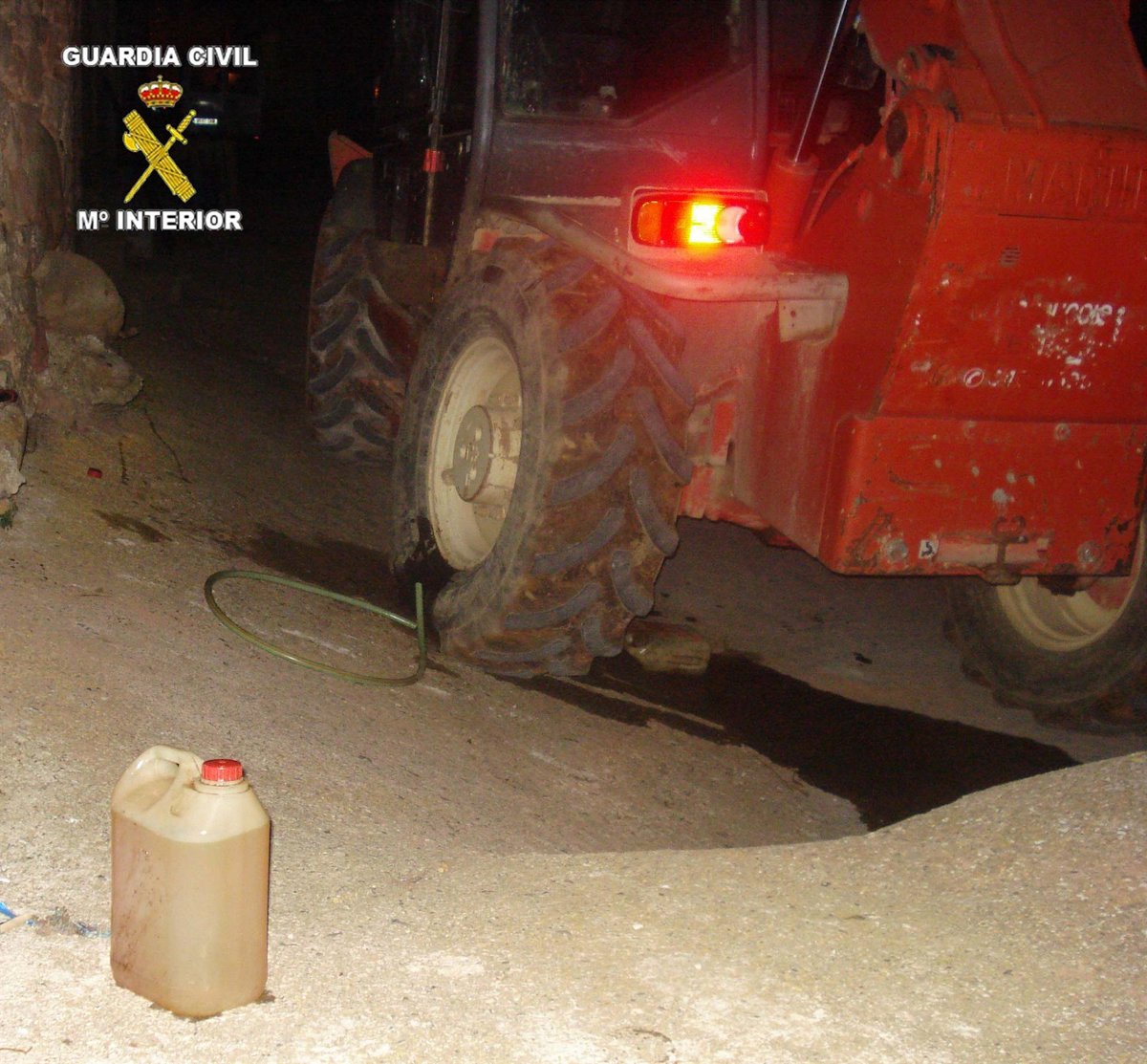 Tras ser interceptado los agentes procedieron a inspeccionar la maquina, observado que el deposito de gasoil había sido violentado con un hacha y que esta persona había extraído gasoil del deposito, concretamente un garrafa de cinco litros, disponiéndose a llenar otra en el momento de ser sorprendido.