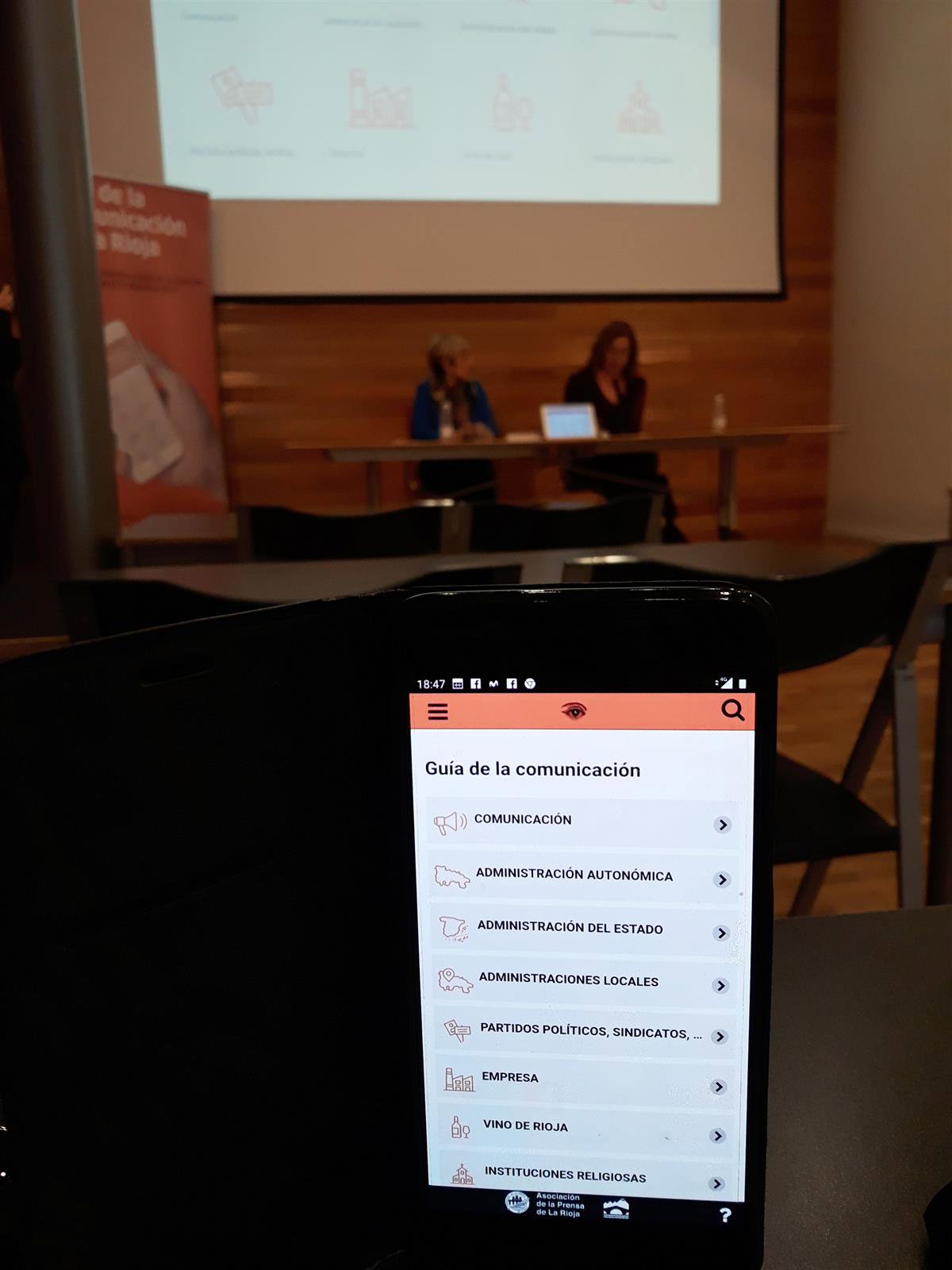 La consejera de Presidencia, Relaciones Institucionales y Acción Exterior, Begoña Martínez Arregui, y la presidenta de la Asociación de la Prensa de La Rioja, Ana Castellanos, han presentado las nuevas herramientas digitales para la Guía de la Comunicación, que se podrá descargar en dispositivos móviles.