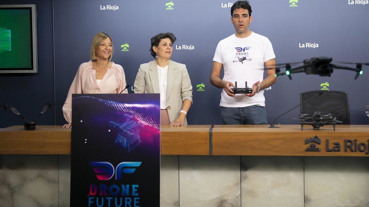 La directora general de Turismo y Promoción Territorial, Virginia Borges, junto a la alcaldesa de Haro, Guadalupe Fernández, y el director general de 'Drones Future', Rafael Ocón, han presentado la tercera edición del Congreso Internacional de Drones que tendrá lugar en Haro del 6 al 8 de octubre.