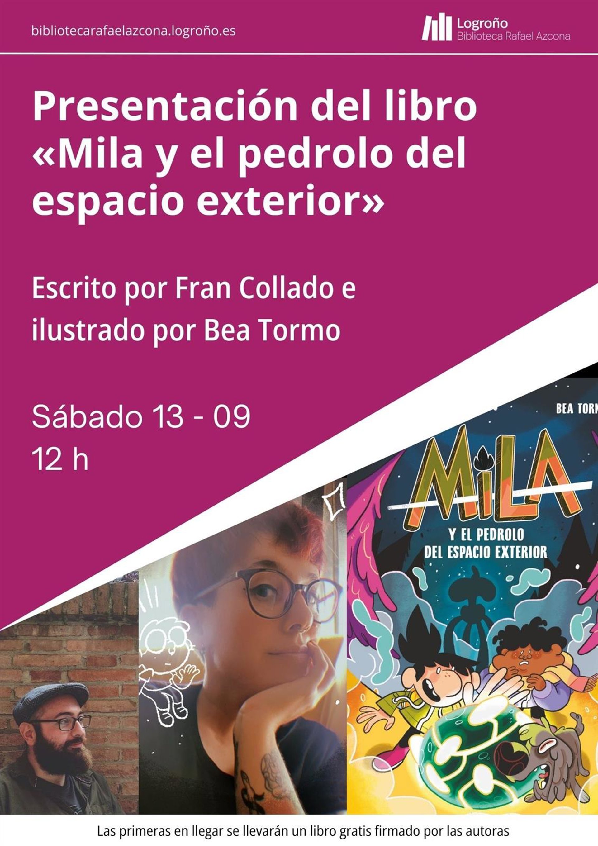 El escritor Fran Collado y la ilustradora logroñesa Bea Tormo presentarán el próximo sábado 13 de septiembre, a las 12 horas, en la Biblioteca Rafael Azcona, el libro infantil 'Mila y el pedrolo del espacio exterior'.