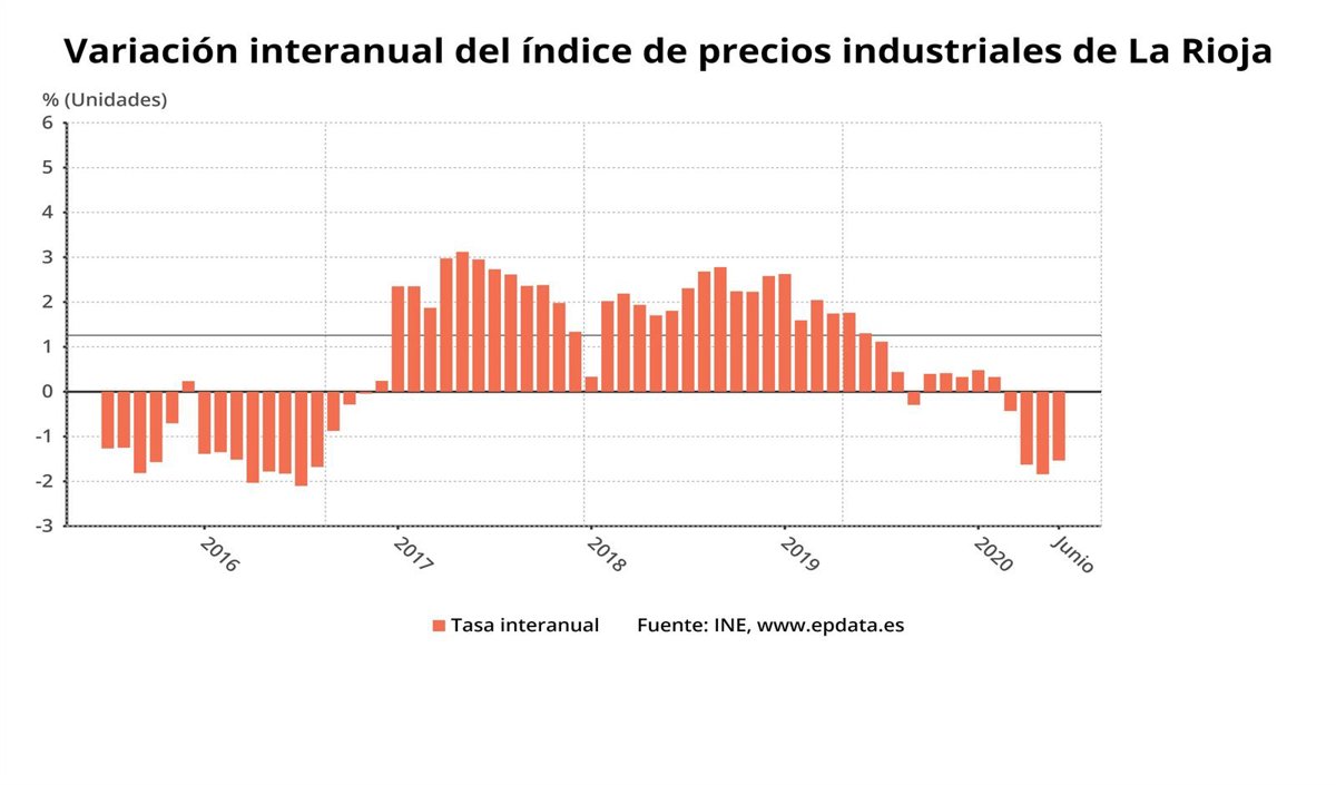 El Índice de Precios Industriales (IPI) cayó un -1,5% en junio en La Rioja respecto al mismo mes de 2019, y experimentó también un descenso del -1,3% en comparación con el mes anterior, según ha informado el Instituto Nacional de Estadística (INE).