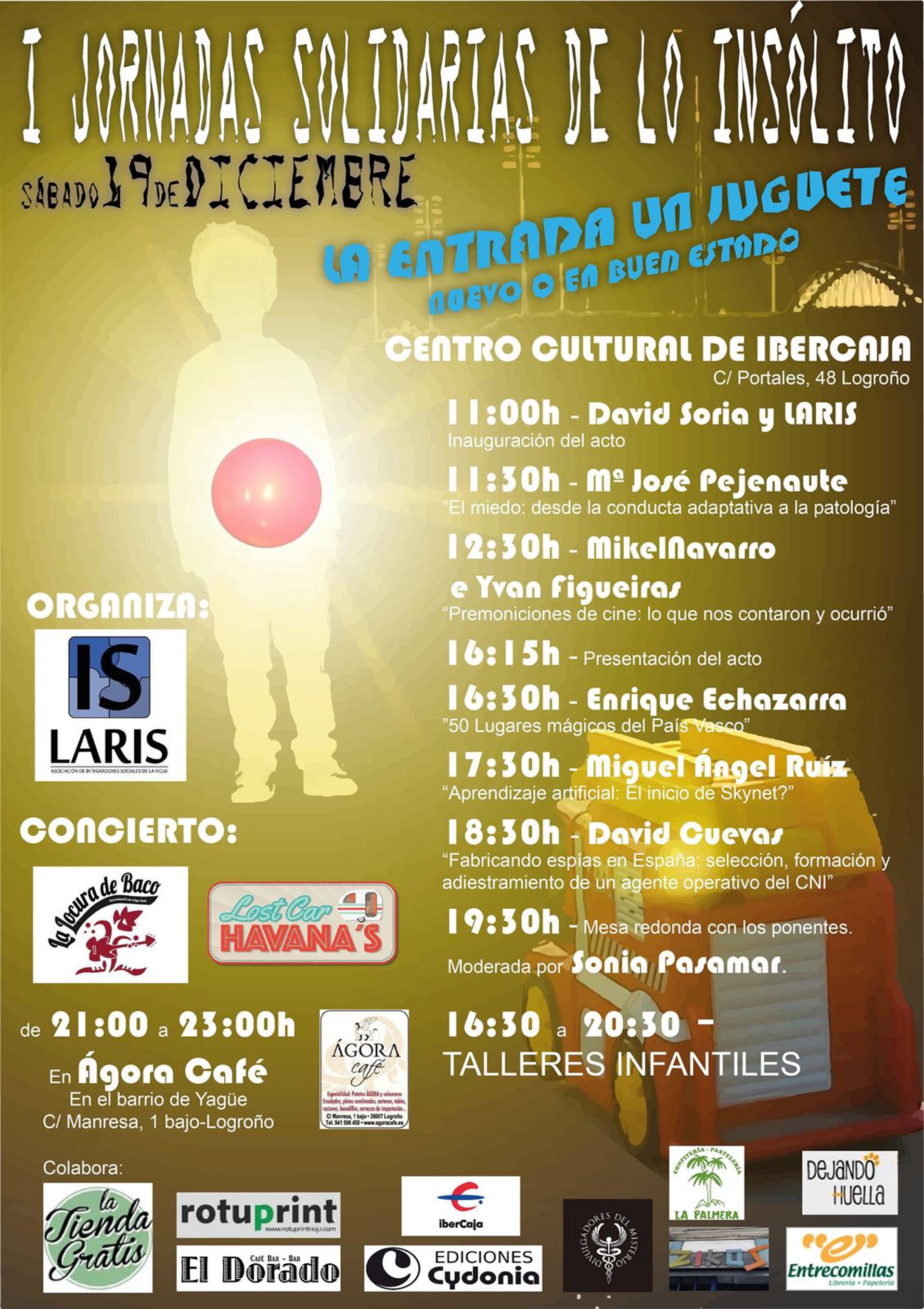 La Asociación de Integradores Sociales de La Rioja, LARIS, y el Centro Ibercaja La Rioja organizan las Primeras Jornadas de lo Insólito, en las que se profundizará en el miedo y el misterio, y que culminarán con un concierto de rock. La entrada es un juguete para La Tienda Gratis.