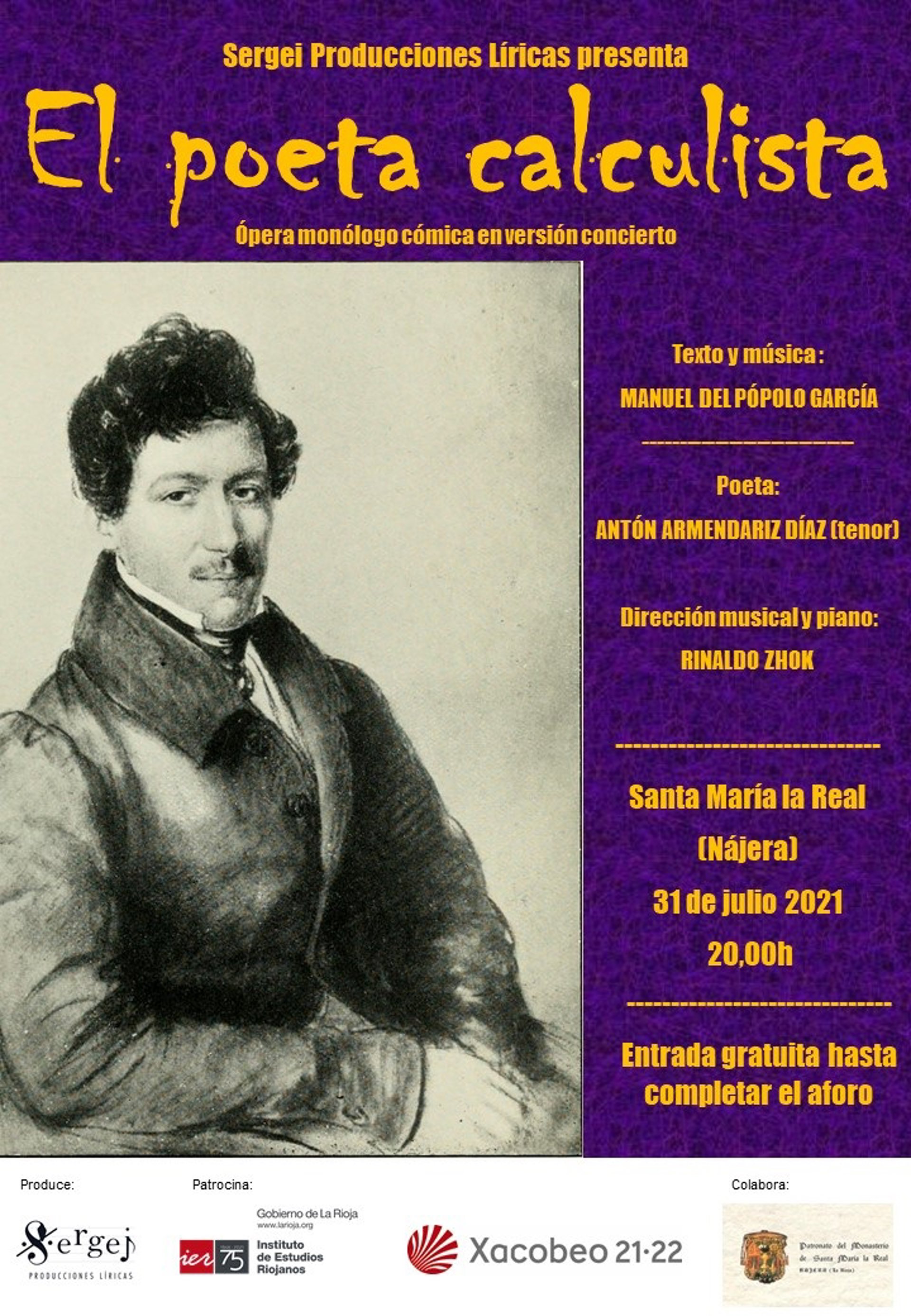 Esta obra cuenta con texto y música de Manuel del Popolo García, y narra las aventuras y desventuras de un poeta al que su prodigiosa imaginación lo lleva a calcular cómo enriquecerse con su trabajo. La representación tendrá lugar el próximo sábado 31 de julio en el Monasterio Santa María La Real de Nájera, a partir de las 20 horas.