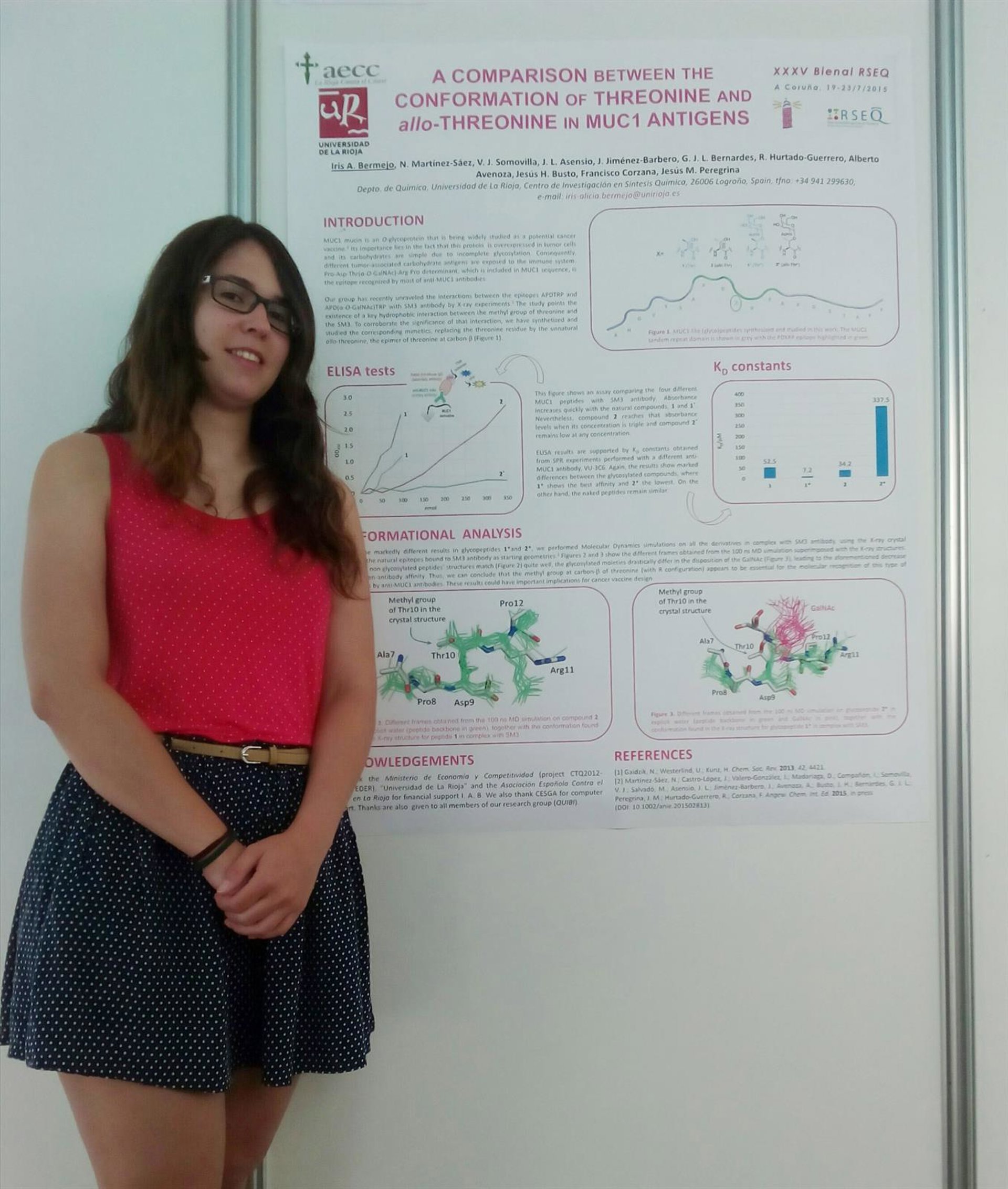 Iris Bermejo desarrolla actualmente su tesis doctoral en el Grupo de Química Biológica de la Universidad de La Rioja sobre la síntesis y realización de ensayos biológicos de vacunas anti-tumorales, para la cual ha recibido una beca de la Asociación Española contra el Cáncer de La Rioja.