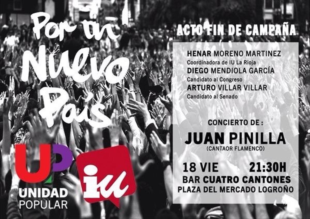Izquierda Unida cerrará, esta noche, la campaña en un acto festivo en el Bar Cuatro Cantones, con la actuación del cantautor flamenco Juan Pinilla y las intervenciones de Mendiola y el candidato número uno al Senado, Arturo Villar.