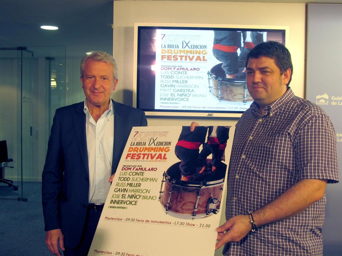 El consejero de Presidencia y Justicia, Emilio del Río, y el director del Drumming Festival La Rioja, Alberto Cuevas, han presentado esta mañana la novena edición del festival, que se celebrará el próximo sábado 7 de septiembre en el Palacio de los Deportes de Logroño.