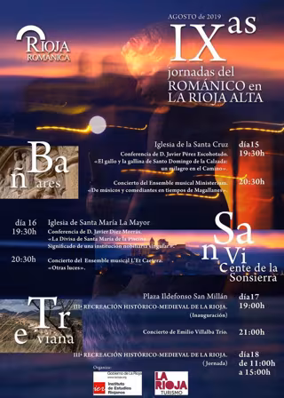 Estas jornadas, organizadas por la Asociación Rioja Románica y que cuentan con el apoyo del IER y La Rioja Turismo, comenzarán en Bañares el 15 de agosto, a las 19,30 horas en la Iglesia de la Santa Cruz, con la conferencia 'El gallo y la gallina de Santo Domingo de la Calzada: un milagro en el Camino', a cargo del profesor Javier Pérez Escohotado. A las 20.30 horas se celebrará un concierto del Ensemble musical Ministerium 'De músico y comediantes en tiempo de Magallanes'.