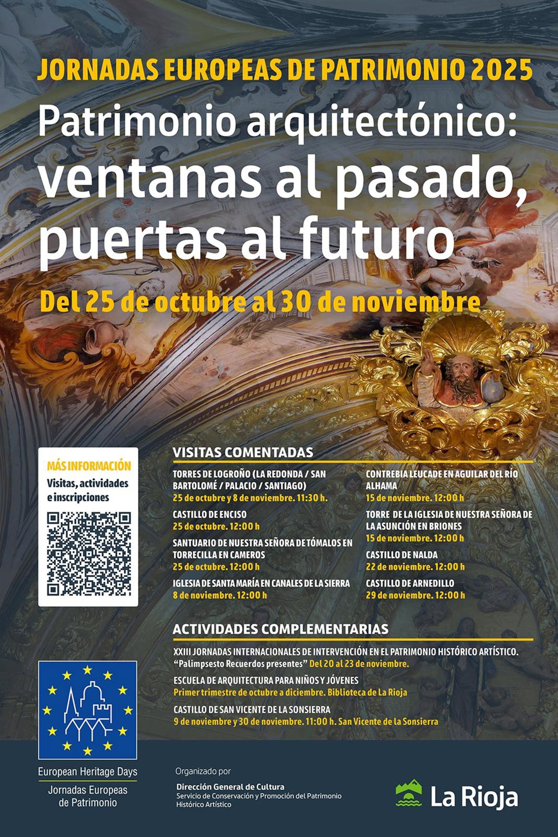 Bajo el lema 'Patrimonio arquitectónico: ventanas al pasado, puertas al futuro', esta nueva edición propone, entre el 25 de octubre y el 30 de noviembre, un recorrido por distintos enclaves de la región que permitirá redescubrir el patrimonio riojano desde una mirada viva y participativa.