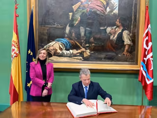 El acto de rúbrica de la dedicatoria ha tenido lugar en el Paraninfo de la Universidad de Zaragoza y ha contado con la presencia de Eva Sanz Arazuri, rectora de la Universidad de La Rioja, quien le ha regalado a Juan Manuel Santos una réplica en madera de la escultura 'Los pilares de la Universidad' de Félix Reyes.