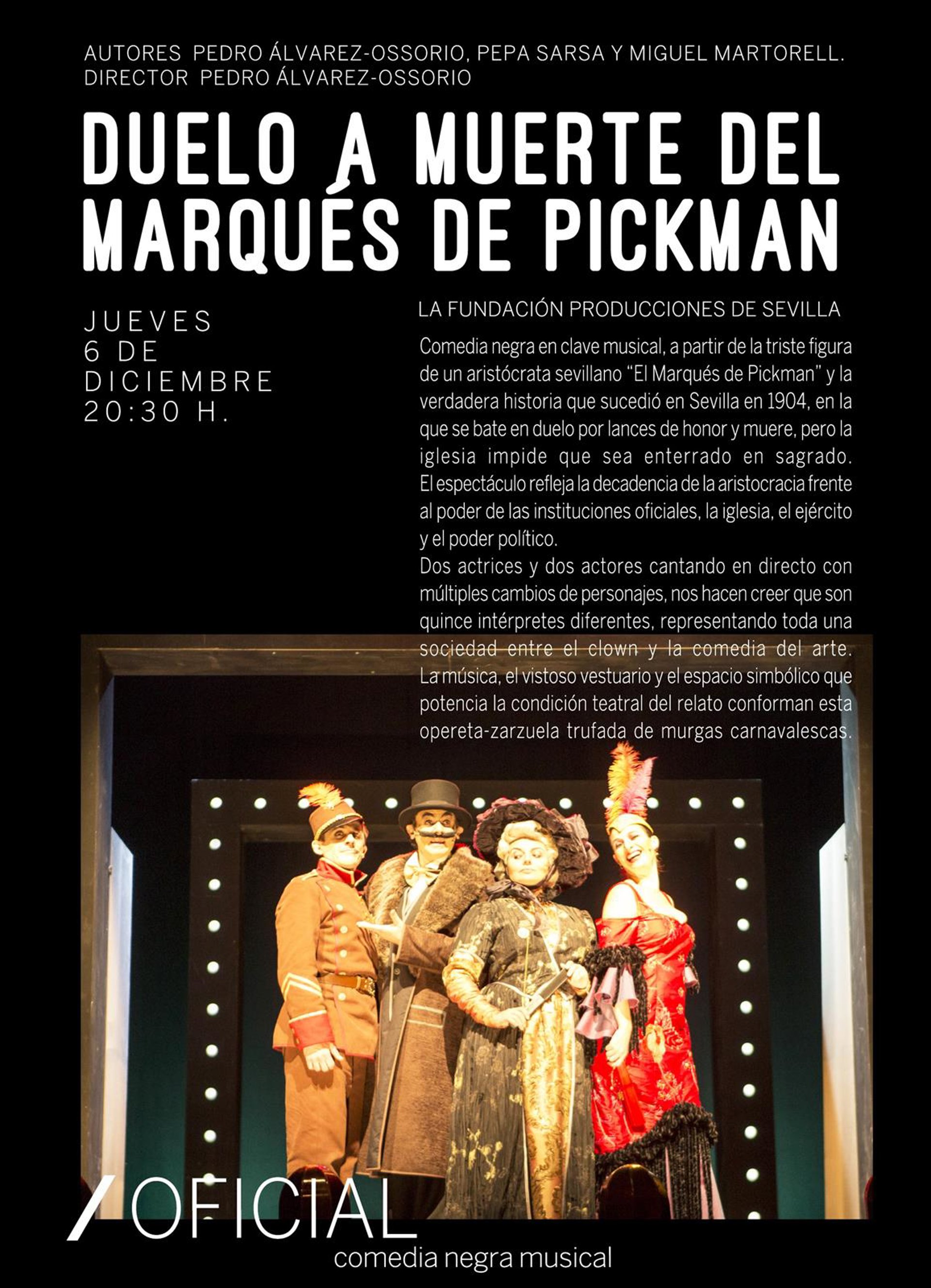 La obra se pondrá en escena a cargo de La Fundición Producciones de Sevilla. Escrita por Pedro Álvarez Ossorio, Pepa Sarsa y Miguel Martorell, esta comedia negra musical parte de la triste figura de un aristócrata sevillano "El Marqués de Pickman".
