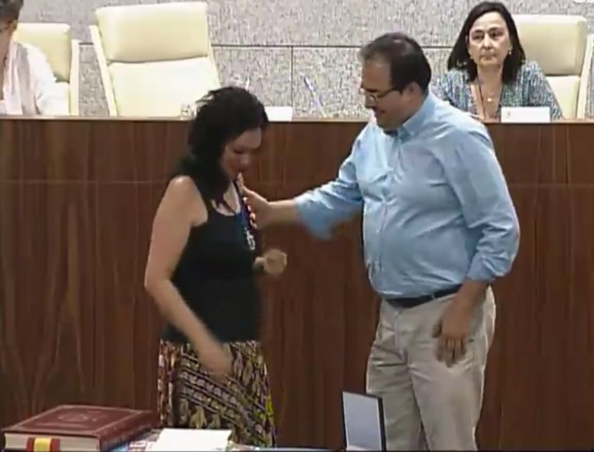 El alcalde de Leganés, Santiago Llorente, ha impuesto la medalla del Consistorio a la nueva concejala, que prometió su cargo mediante la fórmula por "imperativo legal", que ya utilizaron los concejales de Leganemos en el Pleno de investidura.