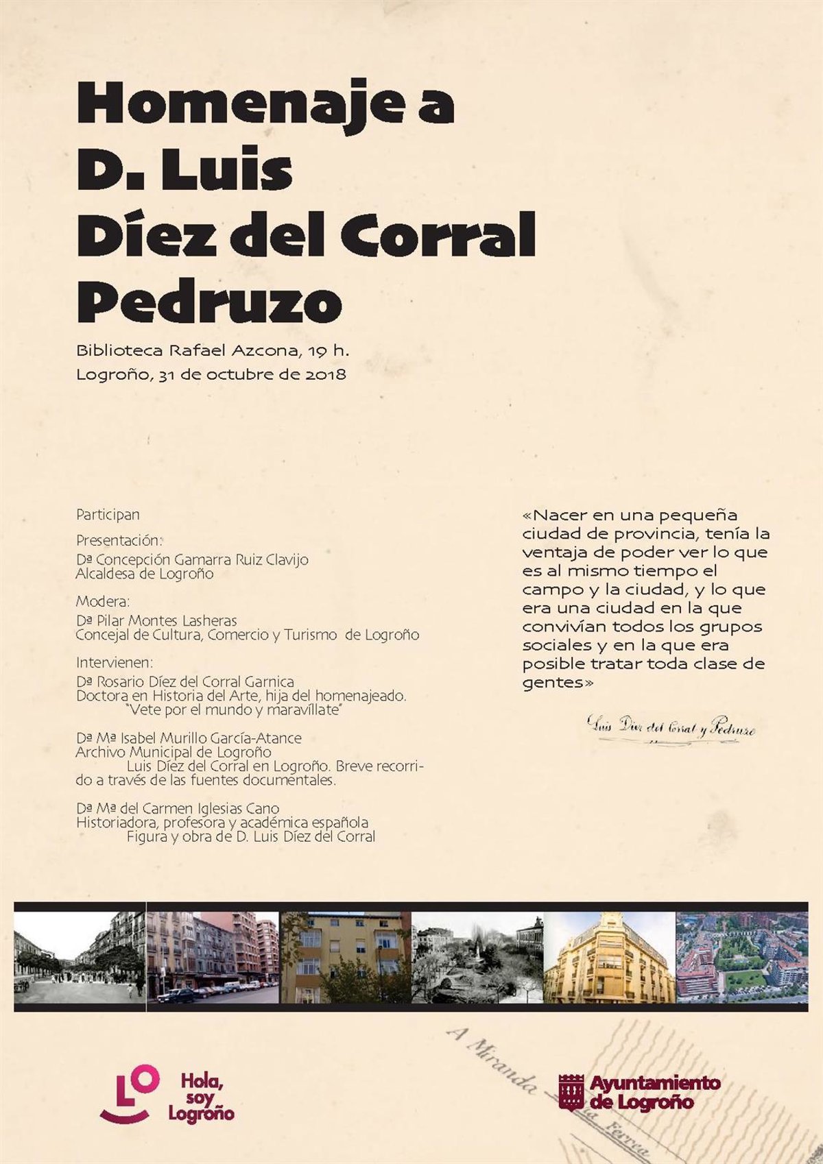 También intervendrá en el evento María Isabel Murillo García-Atance, del Archivo Municipal de Logroño, que realizará una intervención que lleva por título 'Luis Díez del Corral en Logroño. Breve recorrido a través de las fuentes documentales'.