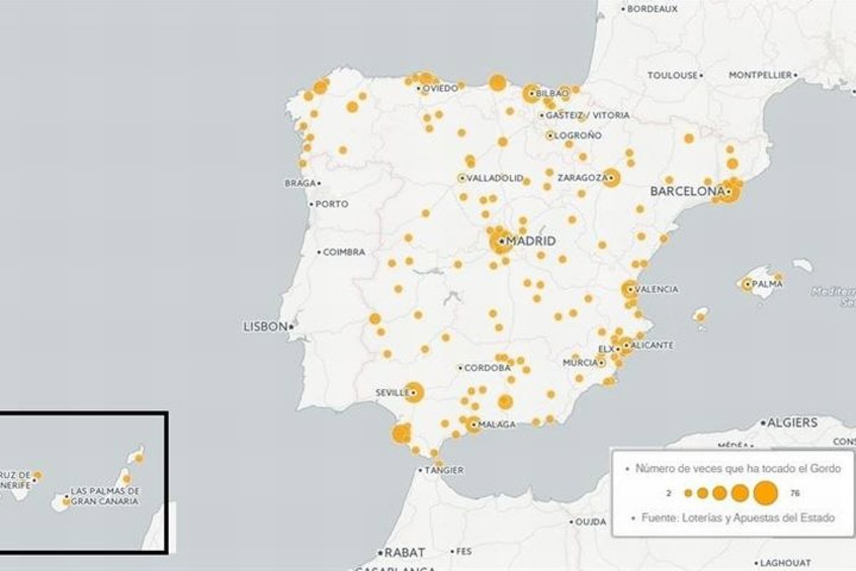 Madrid es la localidad española que más veces ha sido agraciada por el Sorteo Extraordinario de Navidad, ya que el 'Gordo' ha recaído en ella en 76 ocasiones en toda la historia del sorteo.