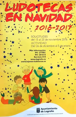 El Programa de Ludotecas en Vacaciones de Navidad 2016-2017 lo desarrolla el Ayuntamiento de Logroño desde su Unidad de Infancia y Juventud, coincidiendo con las vacaciones escolares de Navidad. Podrán participar niños y niñas empadronados en Logroño y nacidos entre los años 2006 y 2013, matriculados entre 1º de Educación Infantil y 5º de Primaria.