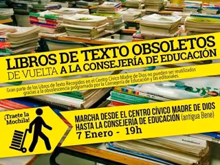 El Centro Cívico Madre de Dios ha organizado una marcha contra la obsolescencia programa de los libros de texto, tal y como anuncia en su página de Facebook.