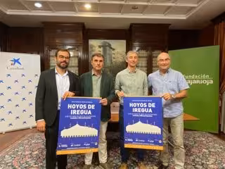 El gerente de Fundación Caja Rioja, Carlos Fuentes Ochoa, y el director institucional de CaixaBank, Iker Muguruza, han presentado este miércoles la nueva edición de la tradicional Marcha Hoyos de Iregua. También han participado Ignacio Sáenz de Urturi, director general de Medio Natural y Paisaje, y Jesús Escarza, representante de la Sociedad de Montaña Sherpa.