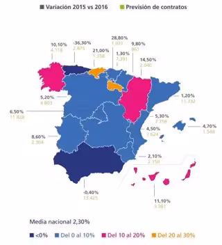 En el lado contrario, por debajo de la media nacional (2,3%), se encuentran Murcia (2,1%), Euskadi (1,3%) y Catalunya (1,2%), que experimentan los menores crecimientos. Andalucía no experimenta apenas variación respecto a 2015 (-0,4%), y Asturias es la región en la que más descienden los contratos firmados por este colectivo de trabajadores, con una caída del 36,3% en el último año.