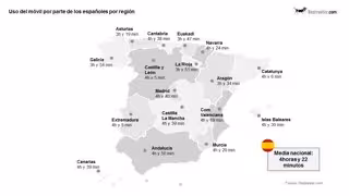 En cuanto al consumo de horas frente al móvil por regiones, los andaluces (4 horas y 50 minutos), madrileños (4 horas y 40 minutos) y canarios (4 horas y 39 minutos) son los que más tiempo dedican. Por el contrario, vascos (3 horas y 47 minutos), aragoneses (3 horas y 34 minutos) y asturianos (3 horas y 19 minutos) son los que se sitúan como los que menos horas lo usan.