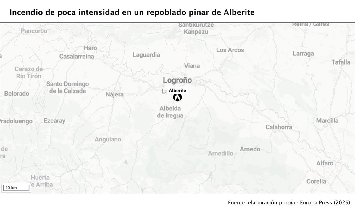 Medios terrestres y áreos han controlado, a las 17,55 horas, el incendio de poca intensidad en una repoblación de pinar en Alberite, que se ha iniciado en el borde del núcleo urbano, ha informado el Gobierno riojano.