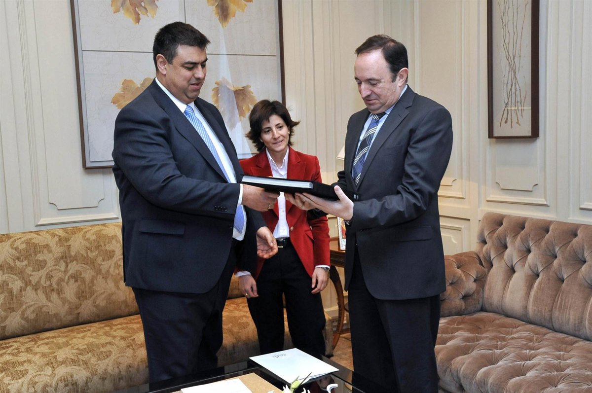 En el marco del programa de actividades organizado por la ONCE por su aniversario, el presidente del Gobierno riojano, Pedro Sanz, ha recibido a la delegada territorial de la ONCE en La Rioja, Estefanía Mirpuri, y el presidente del Consejo Territorial, Juan Javier Muñoz, que le han entregado el libro que recoge la labor desarrollada por la ONCE y la Fundación ONCE 'Aniversarios de Ilusión'.