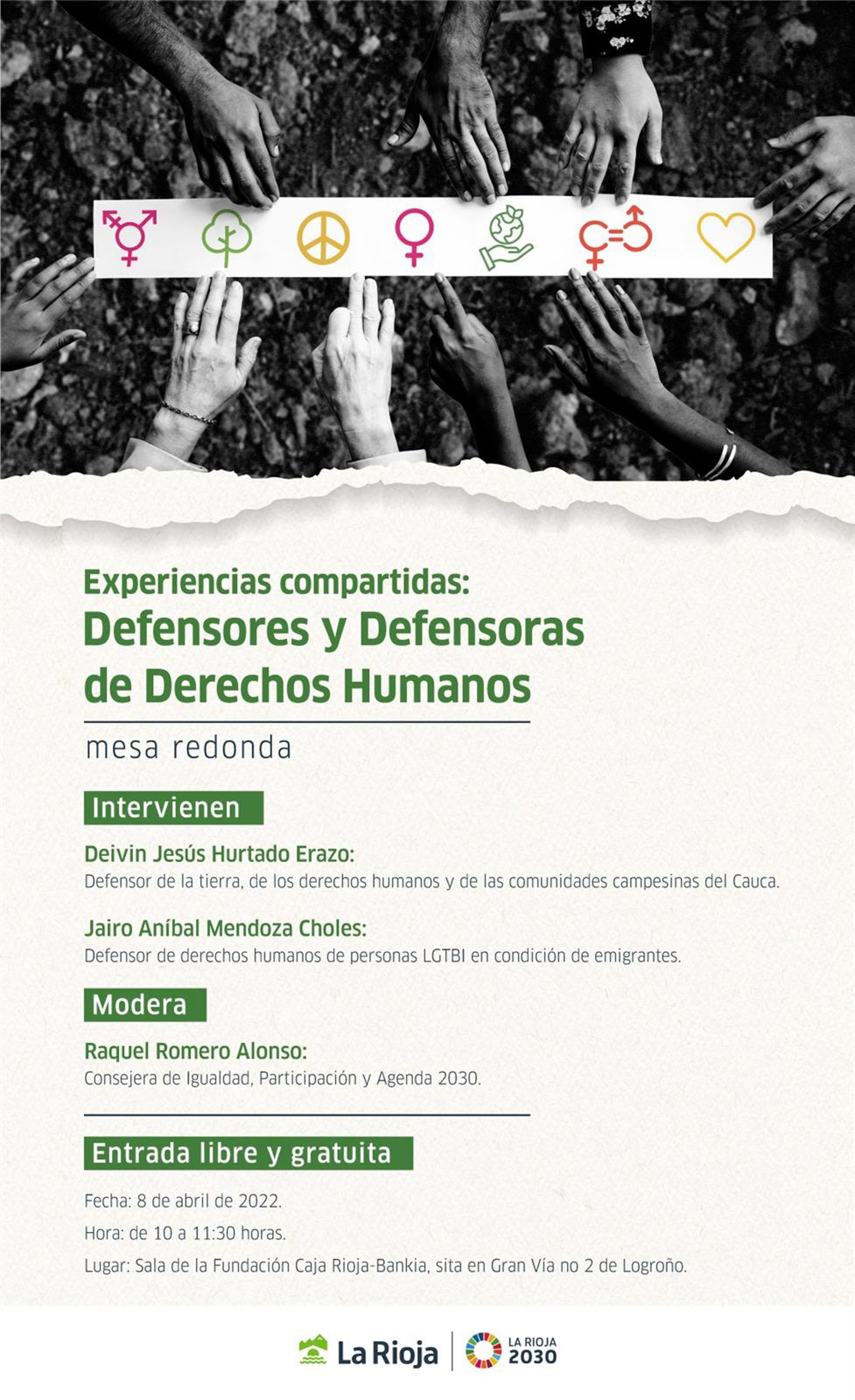CARTEL DE LA MESA REDONDA 'EXPERIENCIAS COMPARTIDAS: DEFENSORES Y DEFENSORAS DE DERECHOS HUMANOS' - CONSEJERÍA DE IGUALDAD