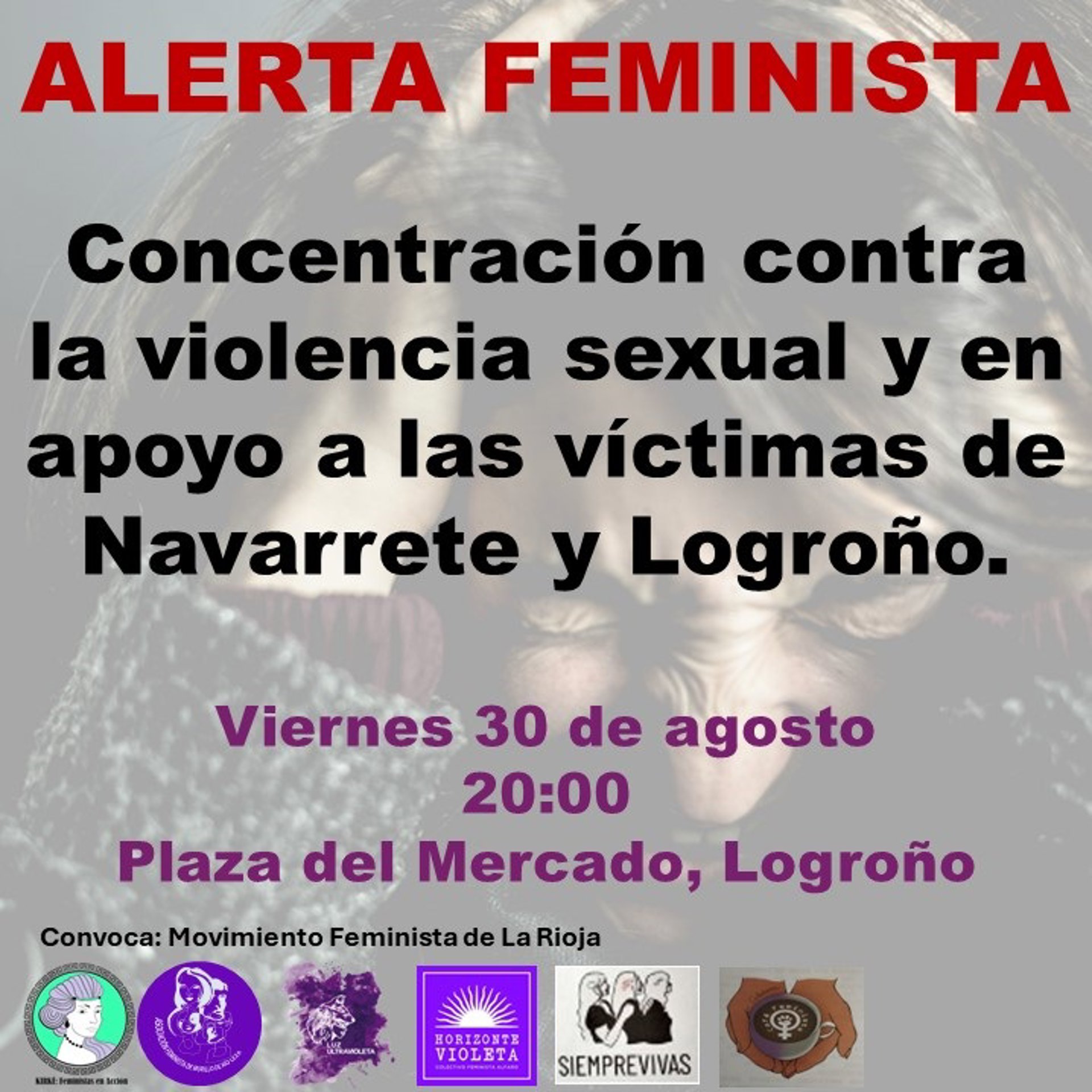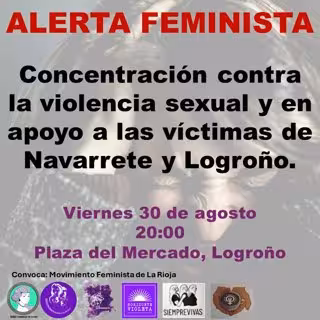 La asociaciones del Movimiento Feminista de La Rioja han convocado a la ciudadanía "a una concentración de repulsa ante el incremento del número de agresiones sexuales en la rioja y en apoyo a las víctimas" de Navarrete y Logroño. La cita tendrá lugar este viernes 30 de agosto a las 20 horas en la Plaza del Mercado de la capital riojana.