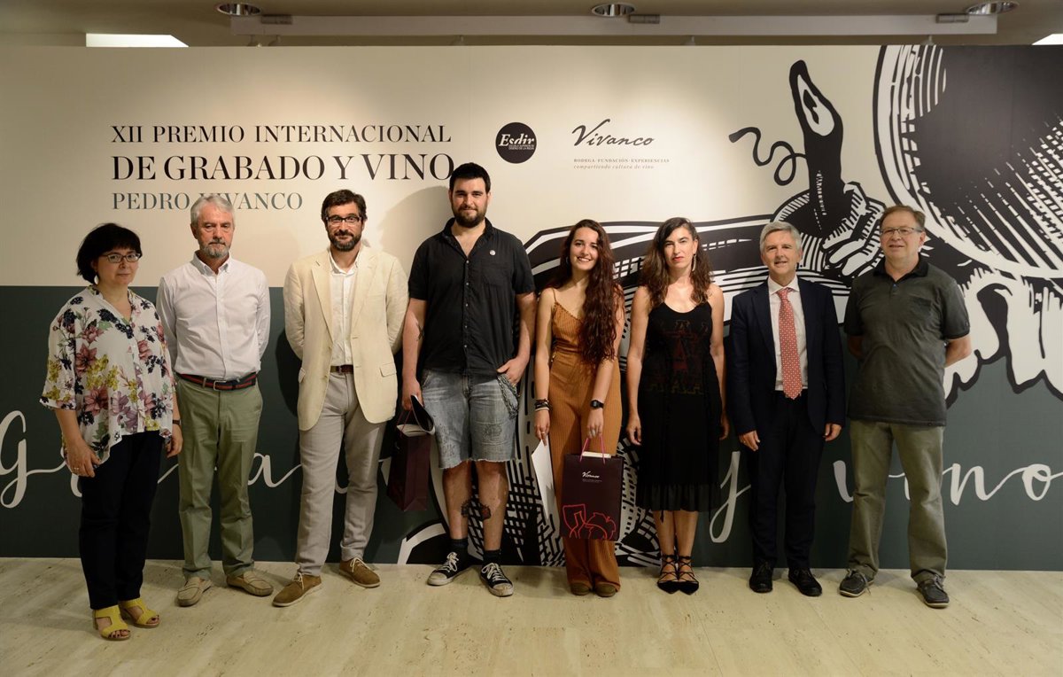 Eduardo Díez, director de Enoturismo y del Museo Vivanco de la Cultura del Vino, y Mónica Yoldi, directora de la Escuela Superior de Diseño de La Rioja (ESDIR), han entregado los galardones a los artistas ganadores del XII Premio Internacional de Grabado y Vino Pedro Vivanco que han viajado hasta la sede de Vivanco Bodega, Fundación y Experiencias en Briones (La Rioja).