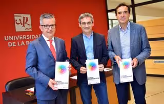 En la presentación han participado Julio Rubio García, rector de la Universidad de La Rioja; Domingo Mendi Metola, gerente de Banca Institucional de Banco Santander en La Rioja; y Javier García Turza, secretario general de la UR.