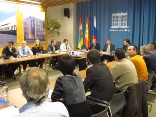 Los consejeros de Agricultura, Ganadería y Medio Ambiente, Íñigo Nagore, e Industria, Innovación y Empleo, Javier Erro, y el embajador de Rusia en España, Yuri P. Korchagin, han mantenido este jueves un encuentro con empresarios riojanos de los sectores del calzado, agroalimentario y vitivinícola, entre otros, interesados en el mercado ruso.