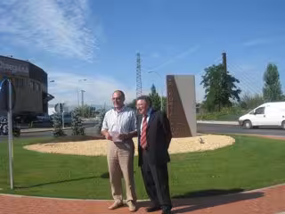 Así, se encuentra un anillo central, con 90 metros cuadrados de césped y en el que se ha instalado un monolito de acero y hormigón, con el nombre del Polígono, y uno exterior, con 150 metros cuadrados de adoquines "que, para el caso de que venga algún camión grande, se podrá pisar".