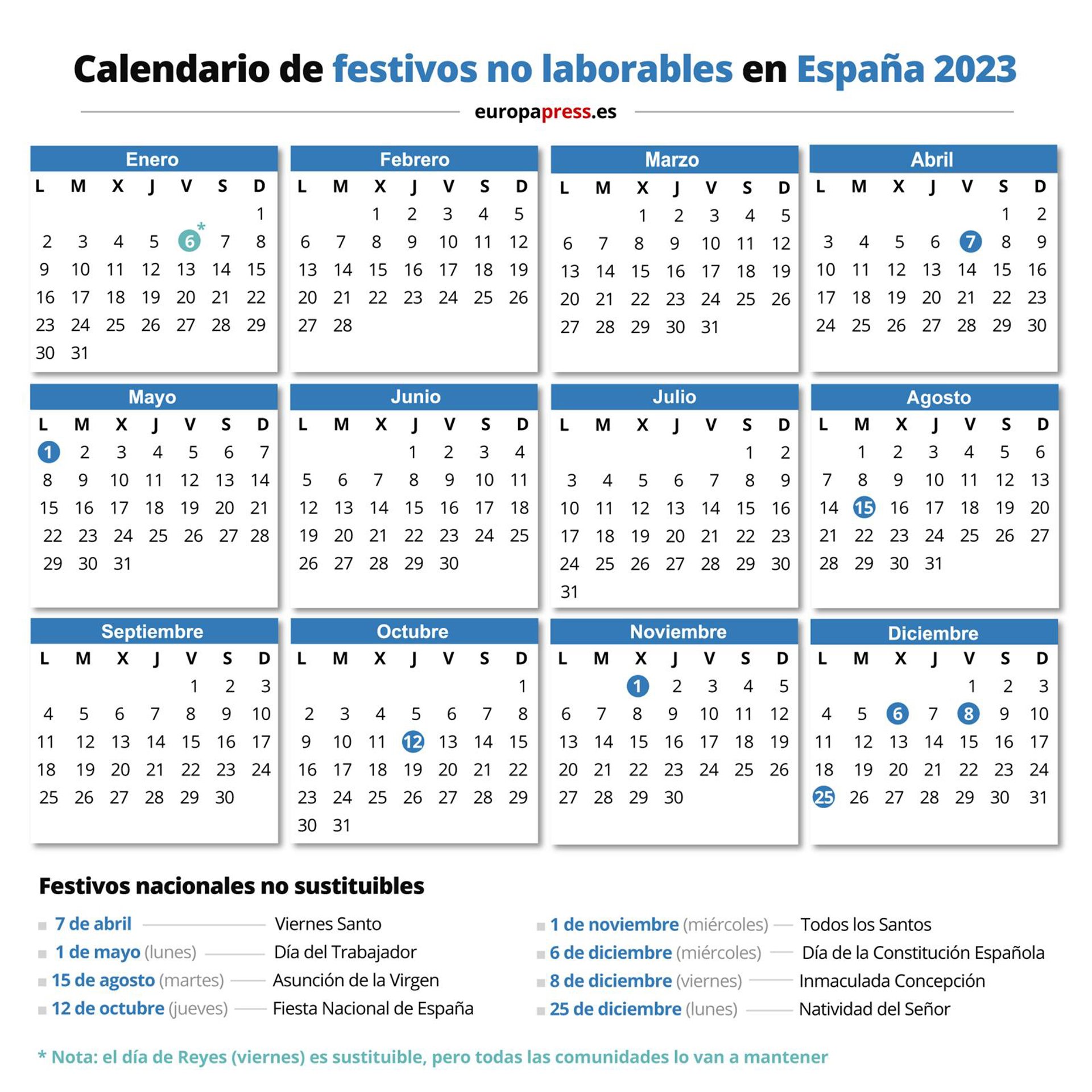 El calendario laboral de 2023 contempla un total de 9 días festivos nacionales que se celebrarán de forma conjunta en toda España, uno más que este año. En total habrá 14 días festivos: ocho nacionales, cuatro autonómicos y dos locales